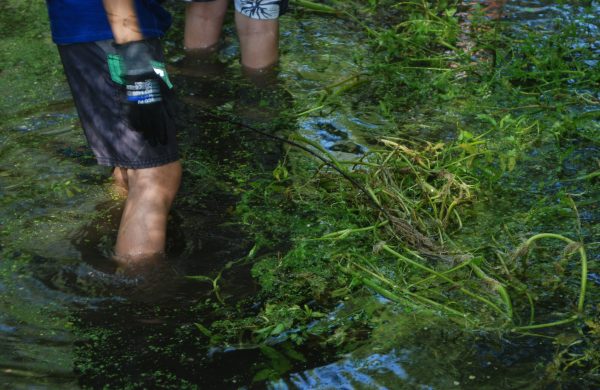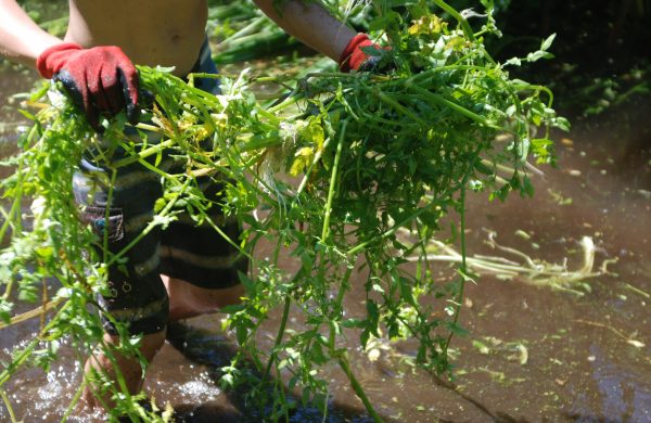 B) Arrencar plantes de créixens bords dels recs i dipositar-los al marge per assecar-los i, posteriorment, retirar-los a la planta de compostatge.