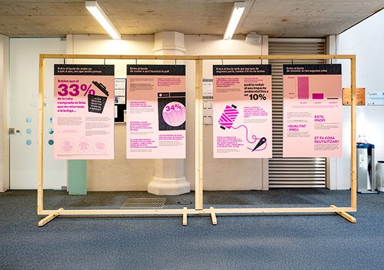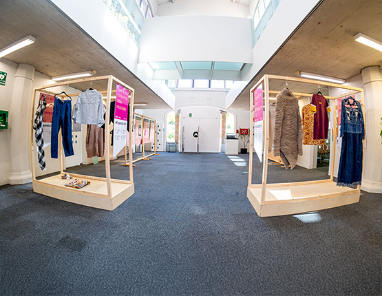 - Àrea expositiva: a través de plafons sensibilitzadors, es transmeten dades rellevants en l’àmbit de la moda circular i la sostenibilitat.
